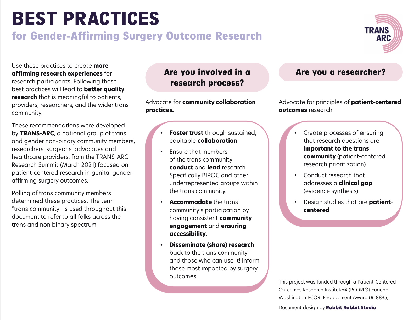 Use these practices to create more affirming research experiences for trans research participants and partners. Following these best practices will lead to better quality research that is meaningful to patients, providers, researchers, and the wider trans community.